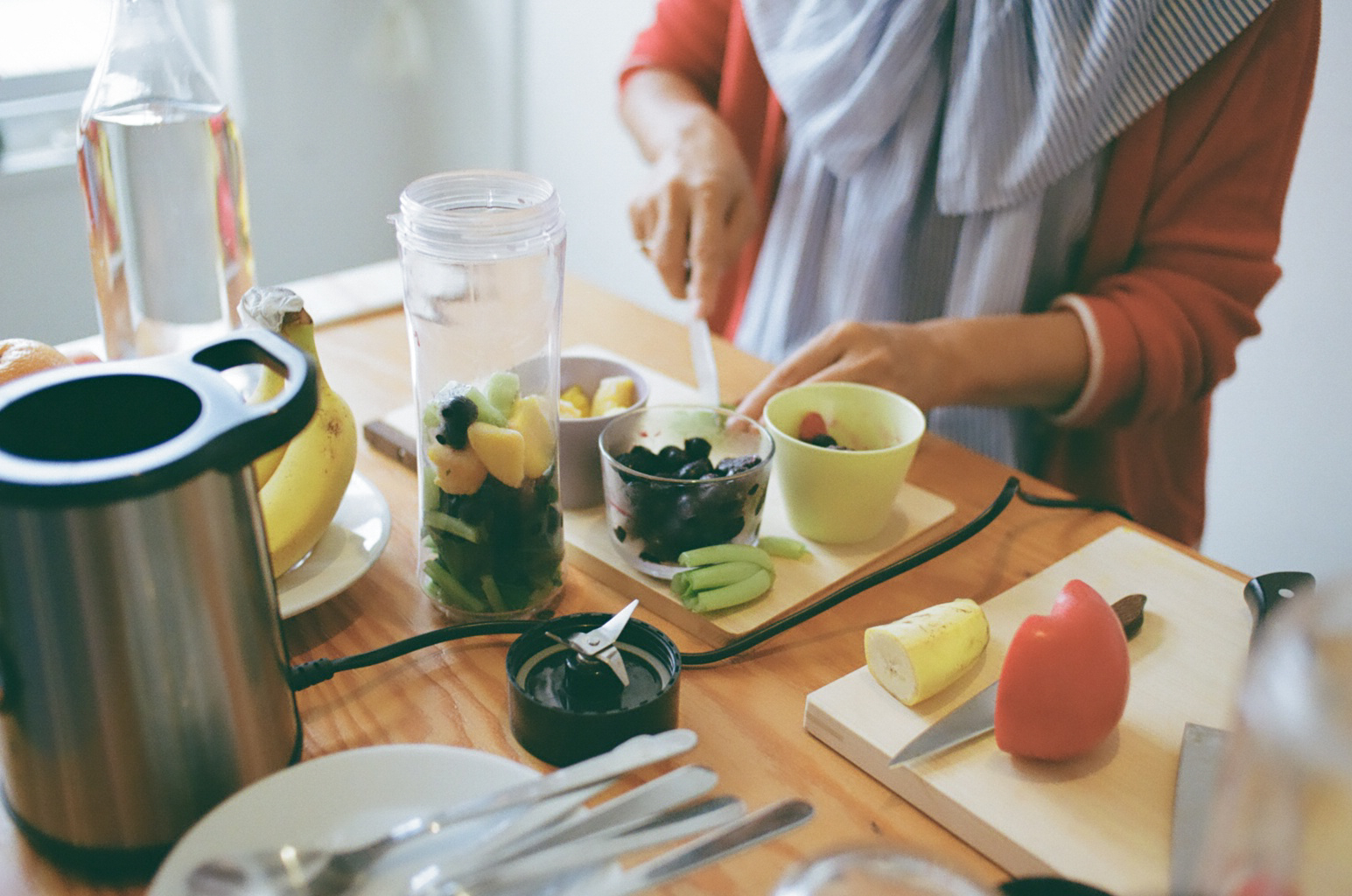 以前、スムージーのレシピをまとめた書籍を執筆したこともある川原さん。「ミキサーの刃に近い場所に果汁の多い柑橘系を入れると混ざりやすいんです」と、ワンポイントアドバイスをいただき、カットした果物と野菜を入れスイッチオン。