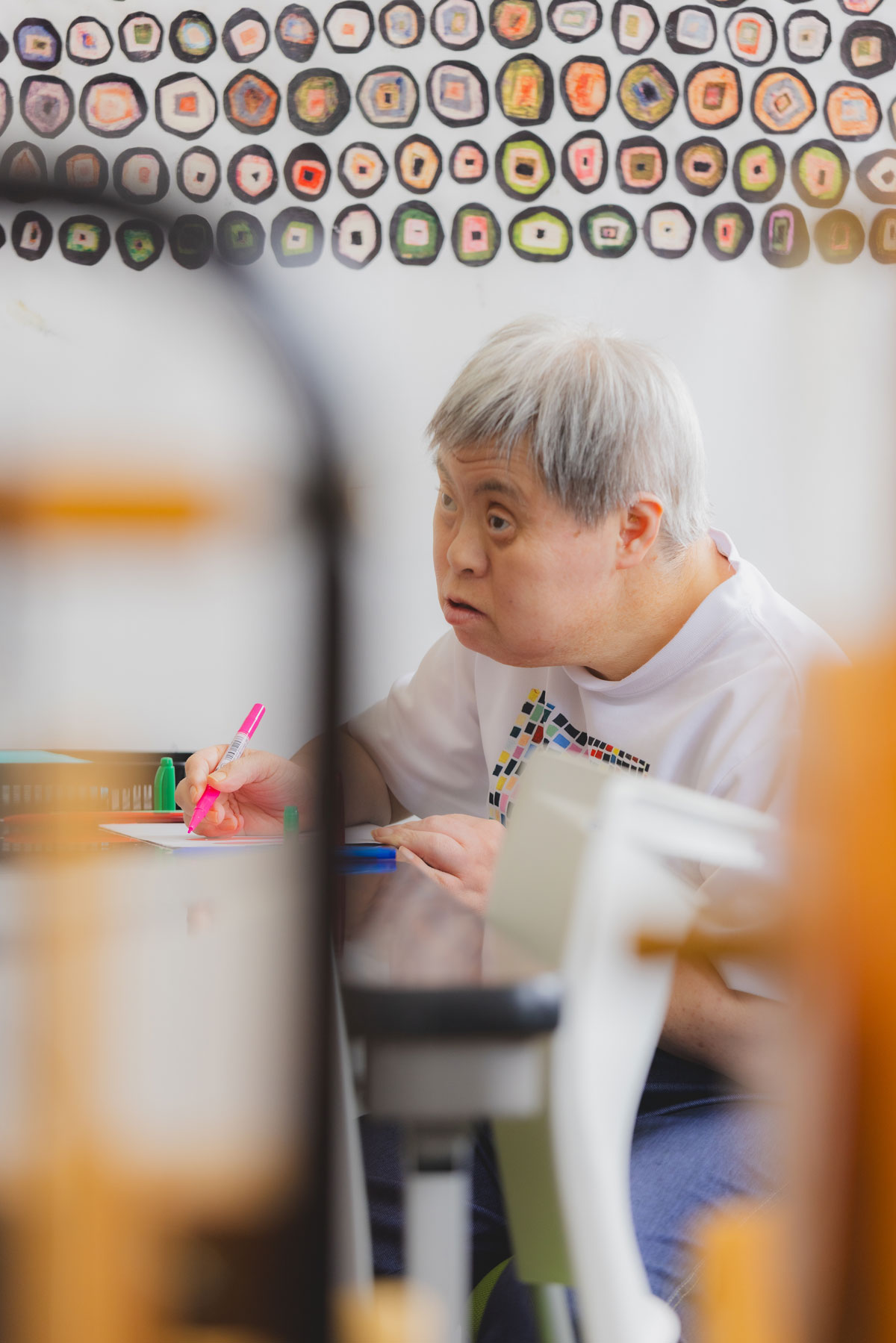 早苗さんは「るんびにい」の座る位置がいつも決まっている。到着したら、座って、ひたすら集中して絵を描き続ける。それが彼女のルーティンだ。