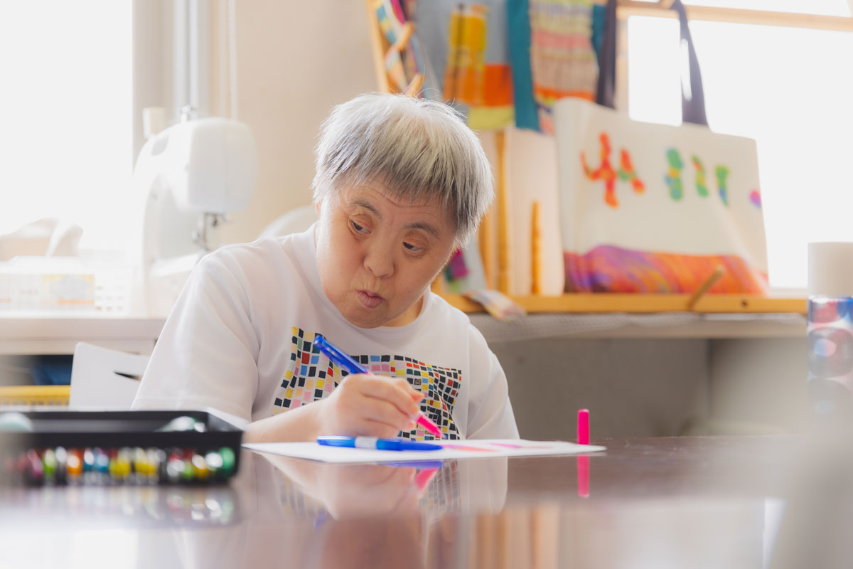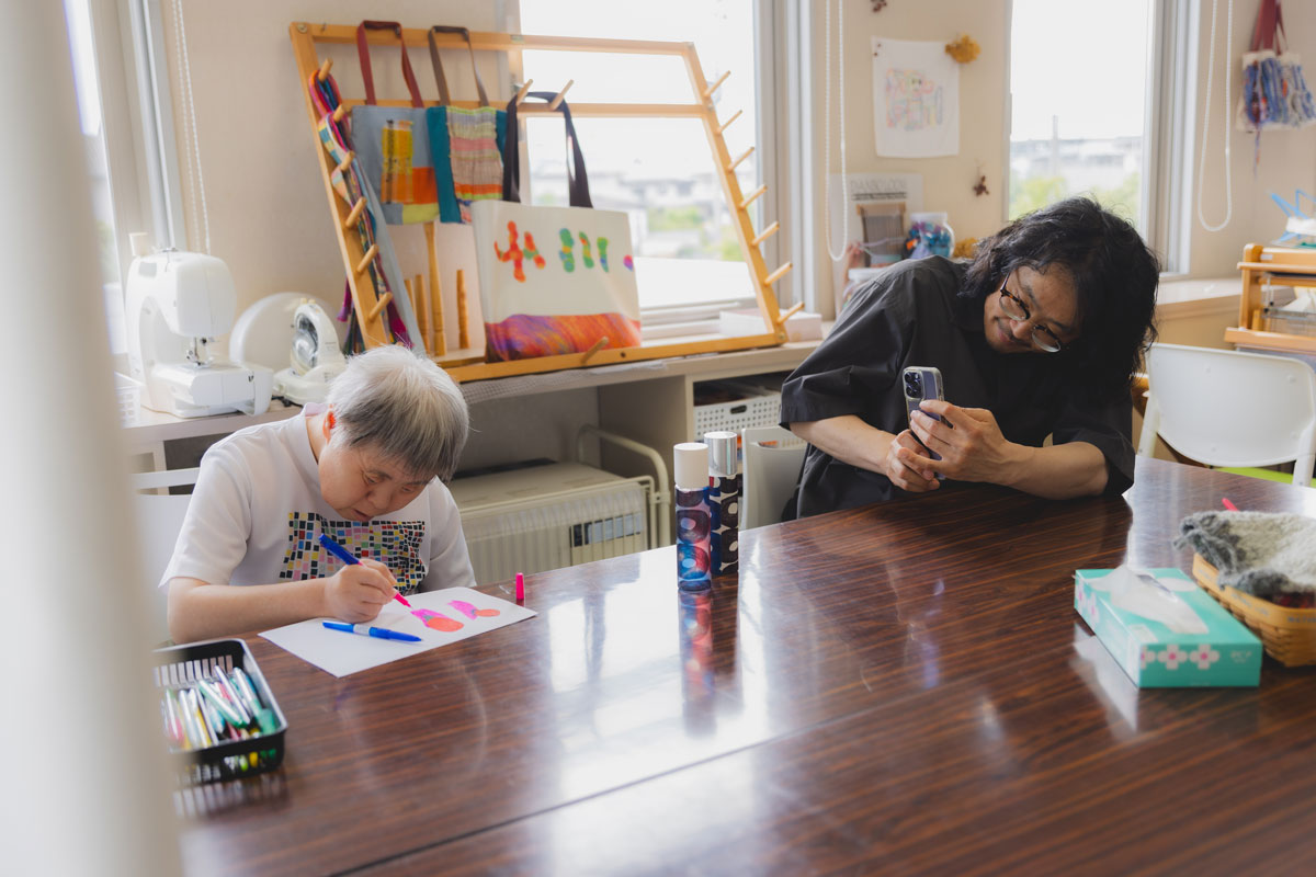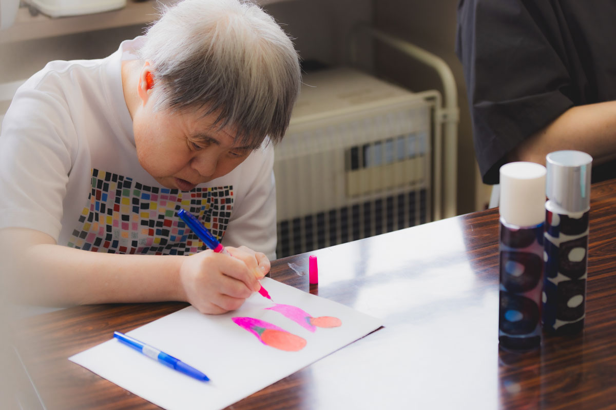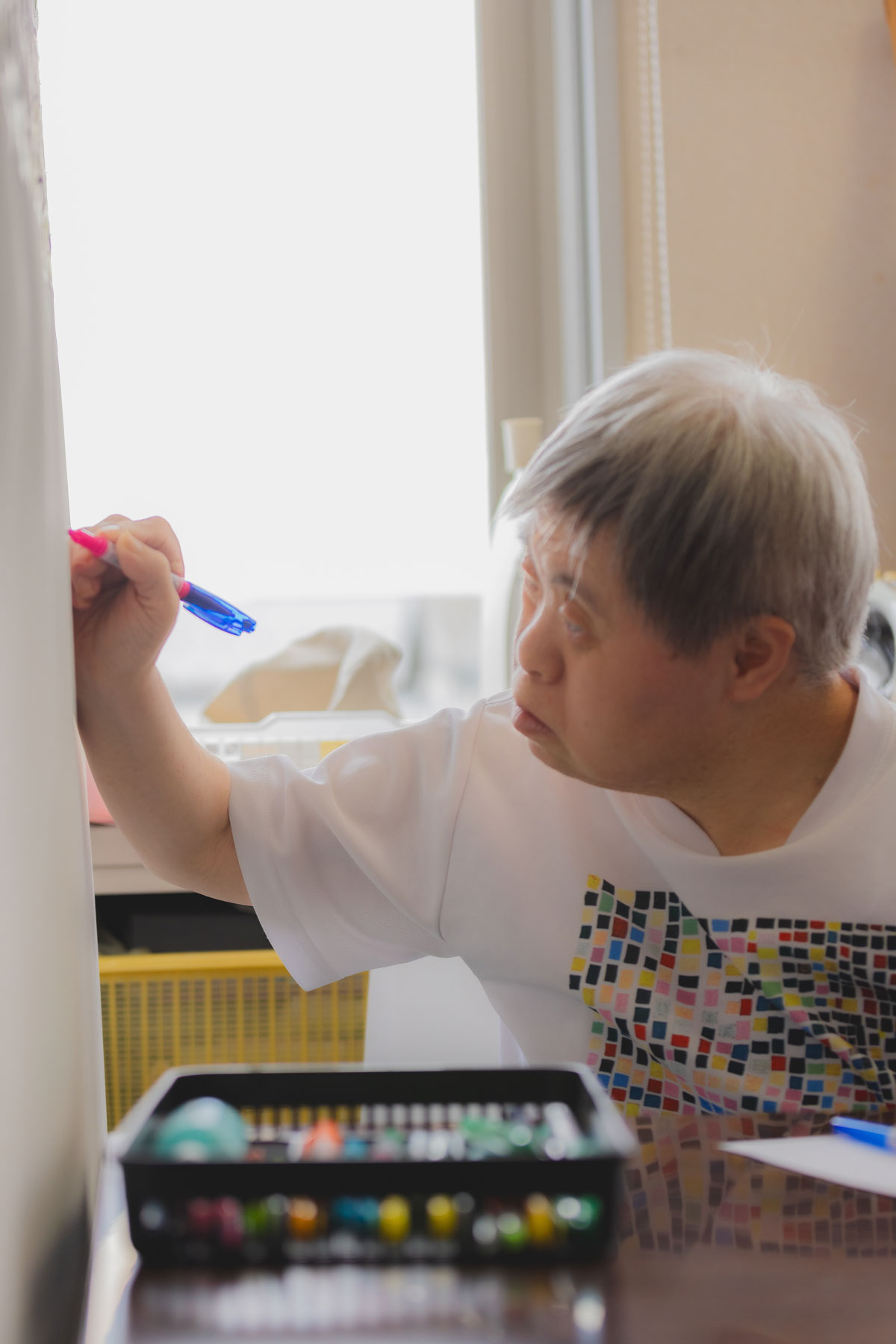 早苗さんは「るんびにい」の座る位置がいつも決まっている。到着したら、座って、ひたすら集中して絵を描き続ける。それが彼女のルーティンだ。